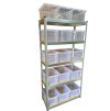 Balíček obsahuje 1 kus regálu Economy 180x90x40 cm a 15 kusov plastových úložných boxov 40x30x20 cm.