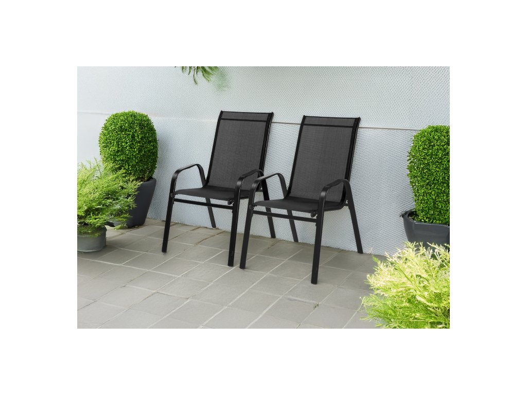 Sada dvoch záhradných stoličiek prináša spojenie nadčasového tvaru a moderného dizajnu, vďaka čomu sa skvele hodí do záhrady, na terasu aj balkón. Čierne prevedenie pôsobí univerzálne a štýlovo, zatiaľ čo hustá textilénová tkanina poskytuje pohodlnú oporu chrbta a zároveň zabezpečuje priedušnosť počas teplých dní.
