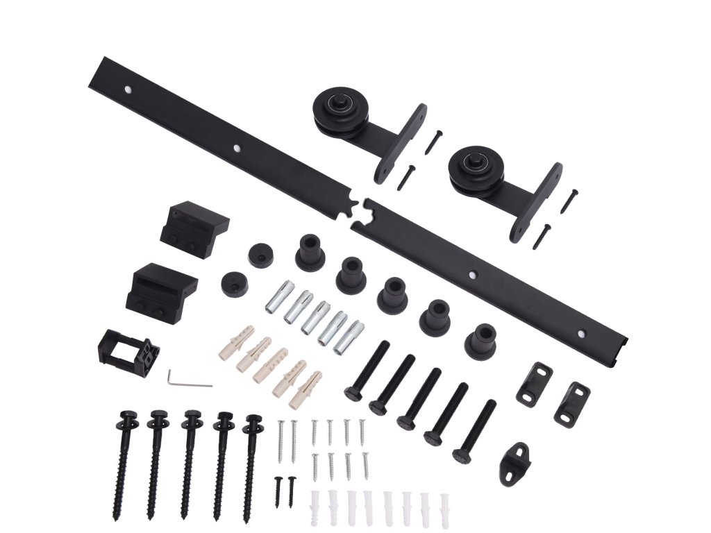 Montážna sada obsahuje aj skrutky a hmoždinky potrebné na ukotvenie k stene. Skrutky sú samozrejme v čiernom prevedení, ako celé kovanie. Súčasťou sú taktiež gumové dorazy, ktoré vymedzujú presný chod dverí a vodiaca plutva na spodnú časť dverí.