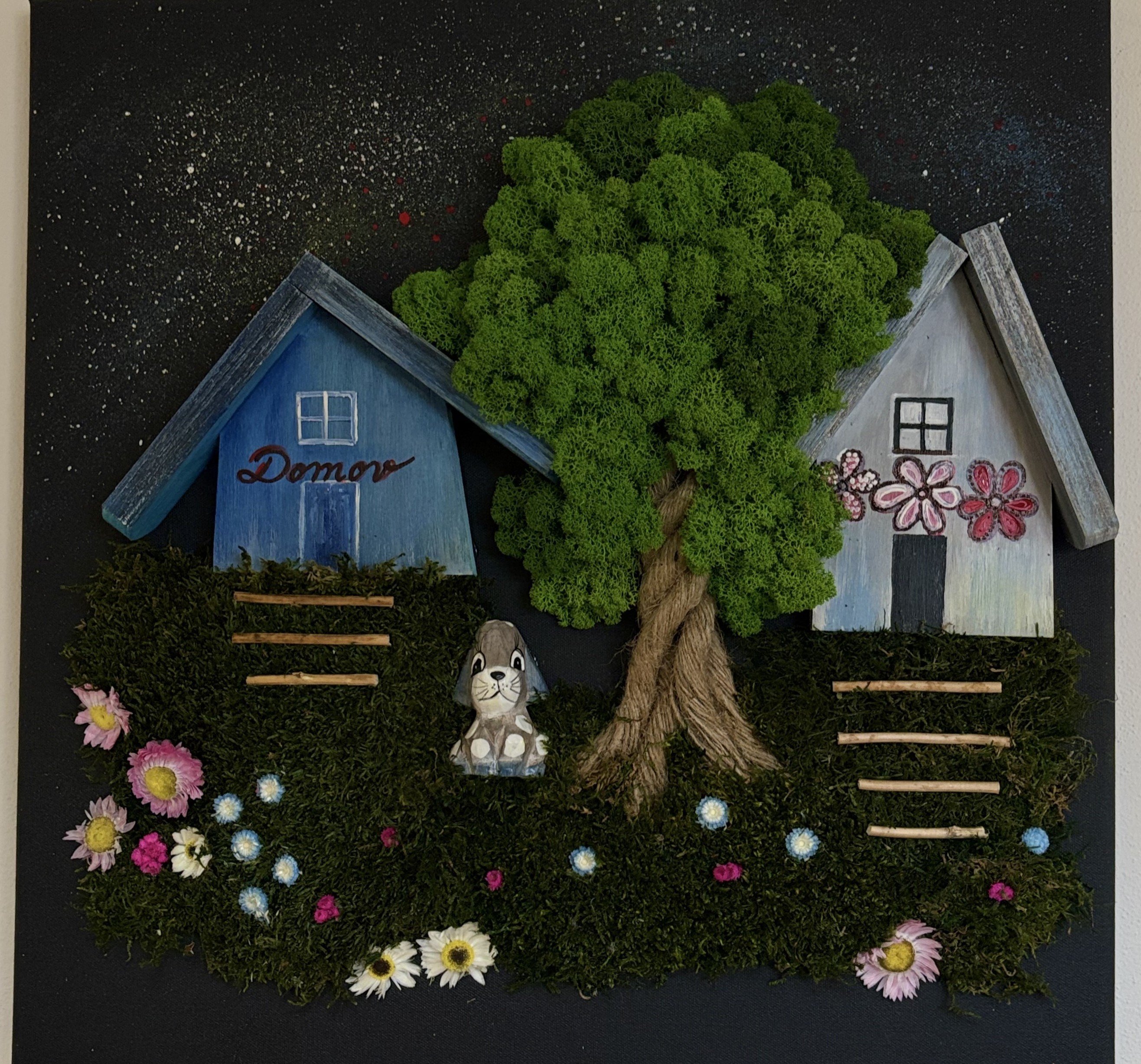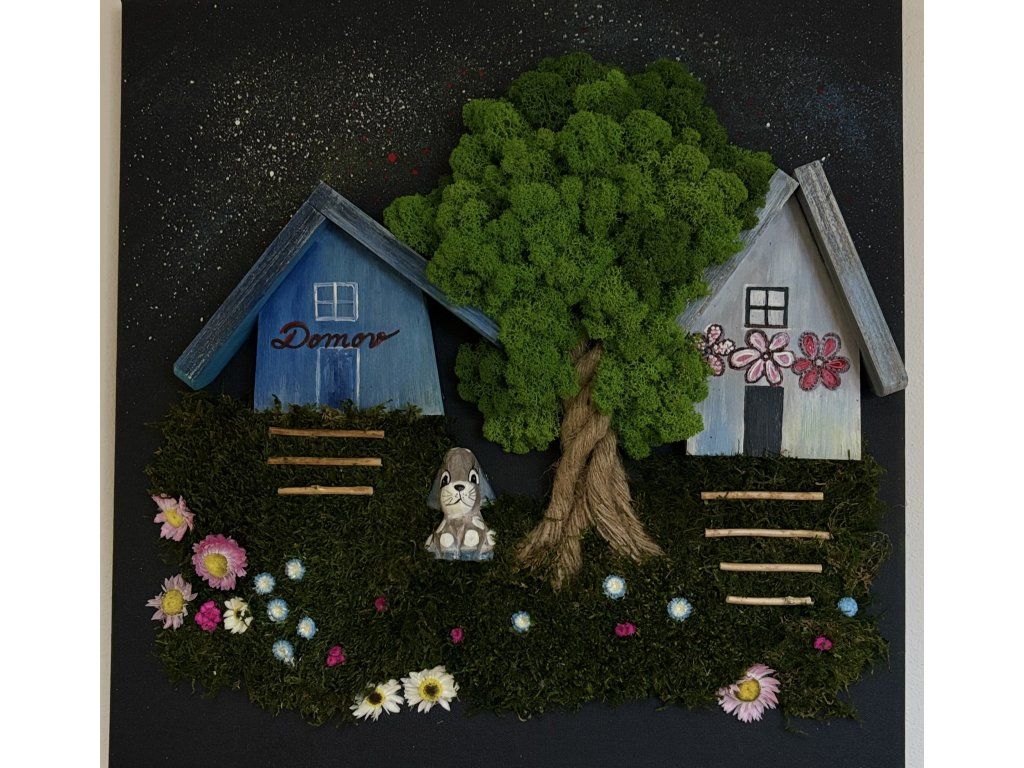 Machový obraz Dedinka so psíkom je jedinečným doplnkom do akéhokoľvek interiéru. Kombinácia lana, stabilizovaného machu a dreva vytvára jedinečný prvok. Interiér zútulní a dodá mu prírodný charakter.