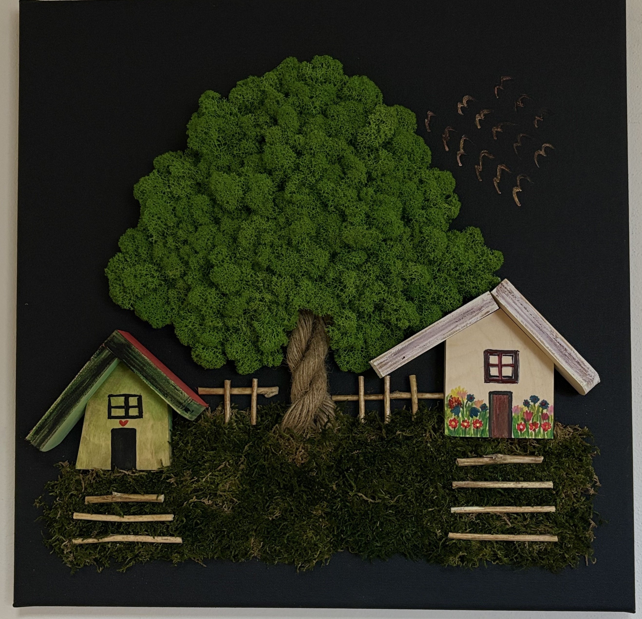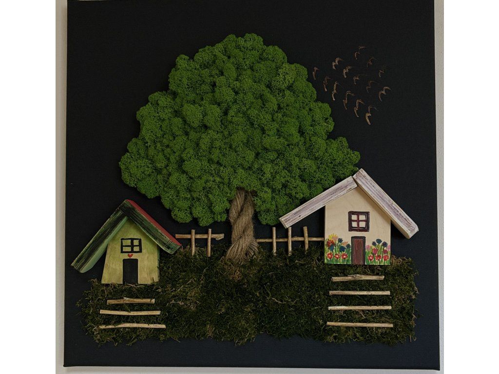 Machový obraz Dedinka je jedinečným doplnkom do akéhokoľvek interiéru. Kombinácia lana, stabilizovaného machu a dreva vytvára jedinečný prvok. Interiér zútulní a dodá mu prírodný charakter.