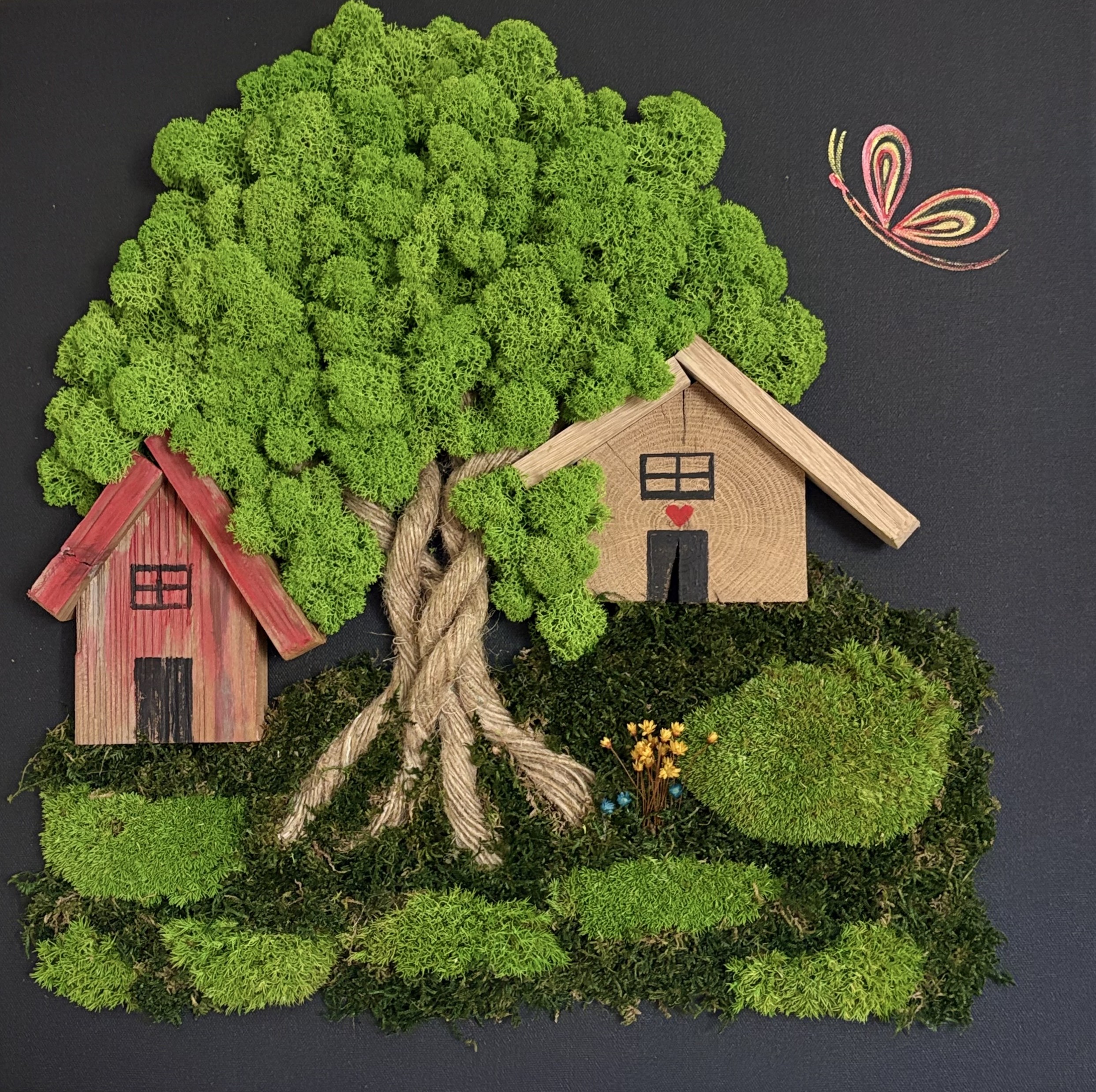 Machový obraz Dom v korunách je jedinečným doplnkom do akéhokoľvek interiéru. Kombinácia lana, stabilizovaného machu a dreva vytvára jedinečný prvok. Interiér zútulní a dodá mu prírodný charakter.