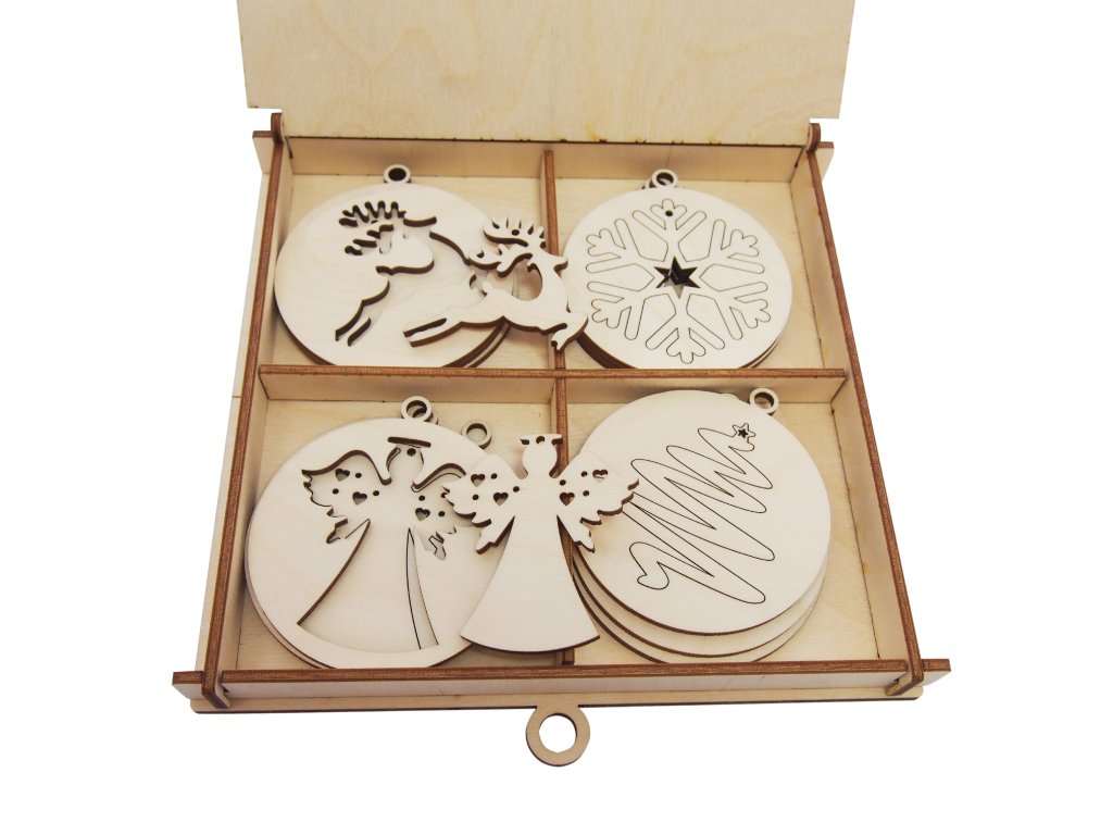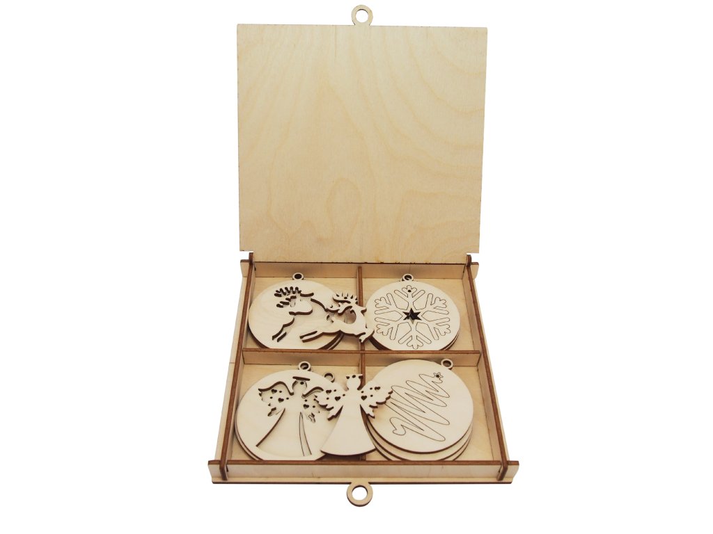 Sada drevených vianočných ozdôb krásne doplní váš vianočný stromček. Nachádza sa v nej 12 ornamentov v tvare vianočných gulí, z ktorých ešte viete vybrať ďalších 12 ozdôb v tvare anjela, soba, snehovej vločky a stromčeka. Ozdoby sú uložené v praktickej drevenej krabičke. Vďaka svojmu luxusnému vzhľadu môžu poslúžiť nie, len ako dekorácia, ale aj ako milý darček.