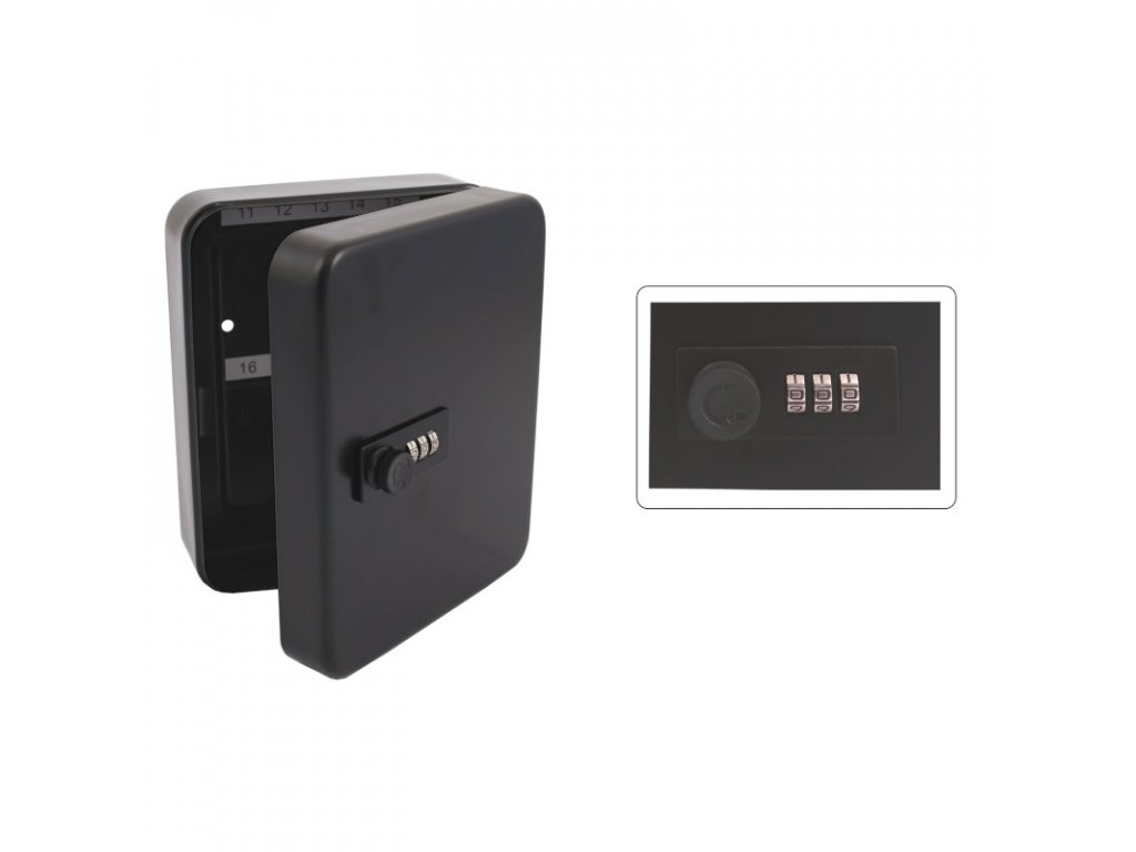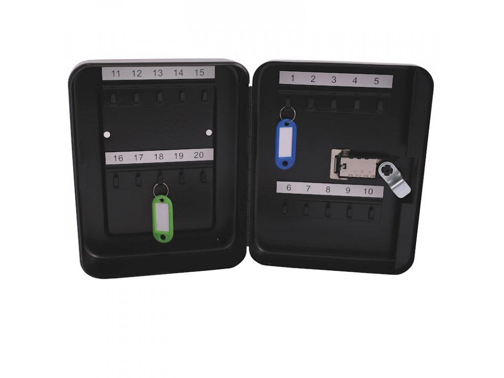 Skrinka je vyrobená z kvalitného oceľového plechu vďaka čomu je ľahká, no súčasne odolná voči poškodeniu. Je ošetrená čiernou práškovou farbou, čo zaručuje ľahké čistenie jej povrchu. Poskytuje jednoduchý spôsob na usporiadanie kľúčov vďaka 20 trvalo pripevneným háčikom. Súčasťou vybavenia je aj kódový zámok.